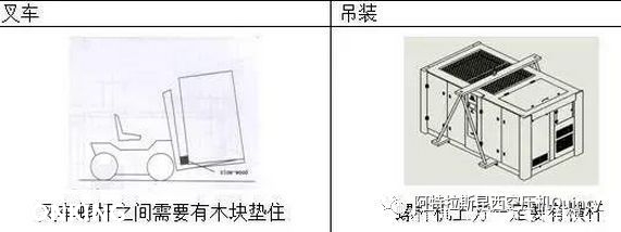 昆西空壓機(jī)在安裝前需要放置在指定位置,在運(yùn)輸放置過程中可以使用叉車或者吊裝的方式進(jìn)行運(yùn)輸放置,但是需要注意操作方式需按下圖展示要求進(jìn)行。