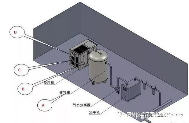 A)配套設(shè)備安裝順序要求如圖,“空壓機(jī)→儲氣罐→氣水分離器→冷干機(jī)”的安裝順序能有效利用氣體流動特性提前排出水分降低冷干機(jī)負(fù)荷。
