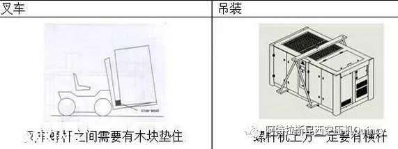 螺桿空壓機(jī)在安裝前需要放置在指定位置,在運(yùn)輸放置過(guò)程中可以使用叉車(chē)或者吊裝的方式進(jìn)行運(yùn)輸放置,但是需要注意操作方式需按下圖展示要求進(jìn)行。